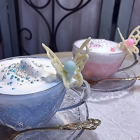 [ミルキーブルーキャラメルミルク/ミルキーピンクいちごみるく] 人気商品スウィートミルクのホット☆バージョンです。パステルカラーの甘いミルクの上に浮かんだふわふわ泡の雲。カップには蝶がひとやすみ。まるで物語の世界のティータイム…。