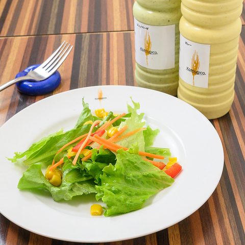 無添加の自家製ドレッシングが人気のグリーンサラダ 焼き海苔、ひよこ豆、カレー、ジェノバなどなど今日は何ドレッシングかお楽しみに(ドレッシングは販売しております)