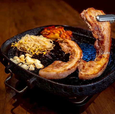 不動の一番人気!ジューシーな国産豚肉を豪快に焼き上げて、特製みそ、キムチ、ニンニク等お好みの薬味と一緒にサニーレタスにも巻いてかぶりつく。お肉も野菜もたっぷり食べられるヘルシーで美味しい韓国式焼肉!