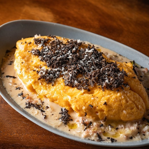ふわふわのオムレツにトリュフを使用したオイルをかけた、贅沢なオムレツです。