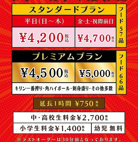 食べ放題と飲み放題が両方お楽しみいただけるコースを「スタンダードプラン」「プレミアムプラン」の2種類ご用意しております!全コースのお時間は3時間とたっぷり!!平日(日~木・祝日)は、よりお得にお楽しみいただけます♪詳しくはコースページをご確認ください!