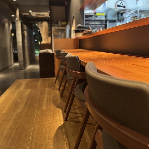 温もりある木の質感が心地よいカウンター席は、料理人との距離も近く、臨場感あふれるひとときをお楽しみいただけます。おひとり様でゆっくり過ごしたい時や、親しい方と肩を並べて語らう時にぴったりの空間。木目が映える落ち着いた雰囲気の中で、季節の逸品や厳選したお酒とともに贅沢な時間をお過ごしください。