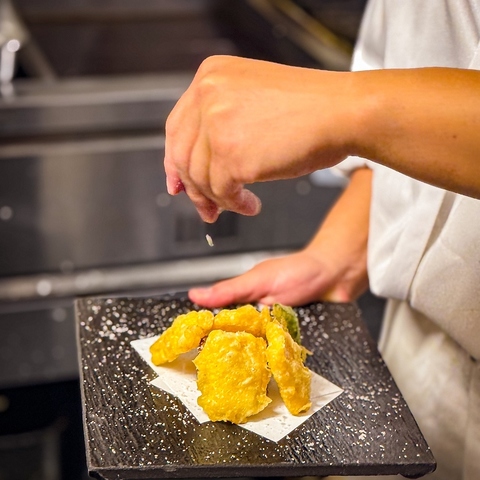 五感で楽しむ贅沢なひととき。衣はサクッと軽やかに、素材の旨みを最大限に引き立てます。仕上げにひと振りされる塩が味を引き締め、見た目の美しさ、香ばしい香り、揚げたての熱々を頬張る瞬間に思わず笑みがこぼれます。丁寧な仕事が生み出す味わいを、ぜひお楽しみください。