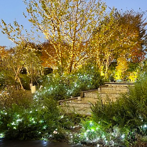 人の心を奪い、心を揺さぶる美しい空間。店内からはイルミネーション輝く、照らすをご覧いただけます。都心の喧騒を忘れさせてくれる、緑豊かなガーデンが広がっています。
