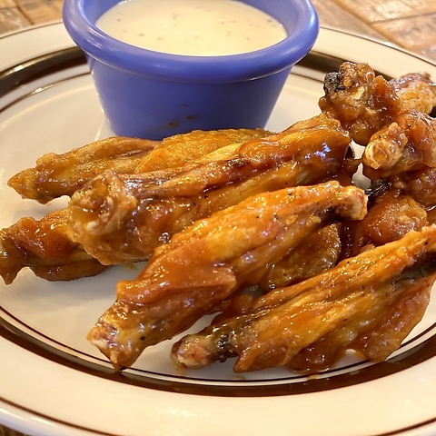 NY、バッファロー発祥の料理。鶏手羽の素揚げを酸っぱ辛いソースで!ソースをバッファローソース、バーベキューソースから選べます。