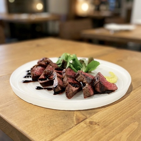 クセのない鹿肉はとても柔らかく、それをミディアムレアで焼いています!赤ワインと醤油で煮込んだ特製のバルサミコソースとの相性もGOOD!