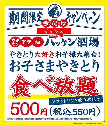 小学生以下のお子様限定!!やきとり食べ放題・ソフトドリンク飲み放題付き500円(税込550円)