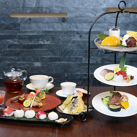 【日本の心と お料理の技を重ね合わせた3段重ねのミニ懐石】和の心が息づく贅沢なアフターヌーンティー。熟練の板前の技と心を籠めております。3つのお皿のお料理は,1.季節の食材を寄せたプレート。2.品評会で日本一の称号を4年連続で受賞した「鹿児島黒牛牛フィレ肉」プレート 3.旬活和食ならではの旬のお刺身。