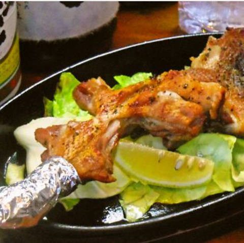 好みに合わせて、柔らかい若鶏と味わい深い親鶏の2種から選べる。にんにく醤油と塩コショウで仕上げた人気の一品。