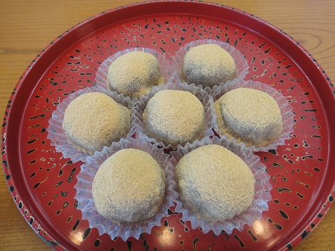 とろとろのこしあんをふるふるのわらび餅で包み、きな粉をまぶしました。