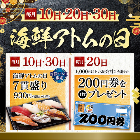 毎月10日・20日・30日は海鮮アトムの日をバラエティ豊かに3本立で開催中!!1,000円以上のお会計で(一会計) 翌日から使える≪200円券≫を1枚プレゼントや、海鮮アトムの日限定季節の7貫盛りをお得な価格でご提供!是非とも、この機会に海鮮アトムへ!!
