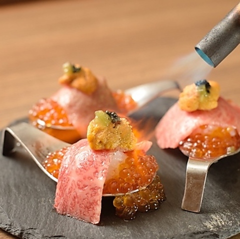 極上のウニが贅沢にのった一口サイズの美味しさ。香ばしく炙られた肉の旨みと、プチプチとしたいくらの食感が絶妙に絡み合い、口の中で華やかなハーモニーを奏でます。新鮮な素材が生み出す深い味わいは、一度食べたら忘れられない贅沢な体験を是非!