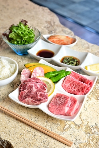 ・キムチ・サラダ・沖縄県産豚の盛り合わせ(あぐー、きびまる豚など)・ライス+200円でソフトドリンク1杯お付けすることが可能でございます。