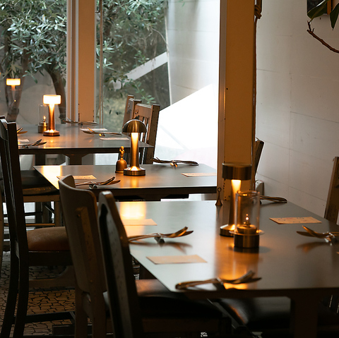 【屋内テラス席】ハイスペックな冷暖房完備なテラス席。時間とともに変化していく空の下で、人間が作りだす自然と地球の恵み、美食に全身が癒されます。