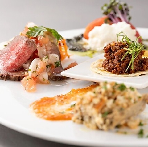 7種類のいろんな前菜が少しづつお楽しみ頂けるVIVI の1番人気のコース、またメインのお料理は当日お店でその時の気分で14品からお好きなお料理を一人1品ずつお選びいただけるので、シェアして様々なお料理をお楽しみいただけます。2名様ならメイン2つ、3名様ならメインは3つ選ぶことが可能です。