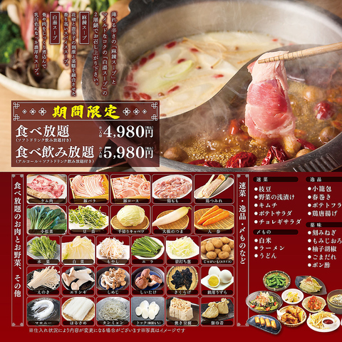 痺れる辛さの「麻辣スープ」とマイルドなコクの「白湯スープ」の2層鍋で厳選豚、特選牛、ラム肉をご堪能下さい♪その他、様々なサイドメニューも食べ放題!ソフトドリンク飲み放題付き!+1,000円でアルコール飲み放題も可!