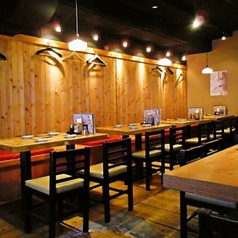 木の温もりを感じるインテリアが心を癒してくれる店内。広々としたテーブル席では、気の置けない友人とゆったりとした時間を楽しむことができます。柔らかな照明が落ち着いた雰囲気を演出し、思わず笑顔になれる空間です。