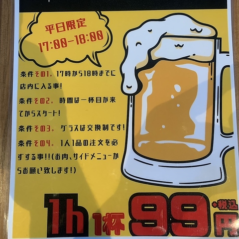 【平日限定17:00ー18:00】ハッピーアワー 1h1杯99円(税込)