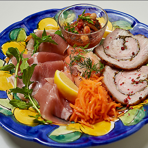 moonイチオシの自家製の前菜盛り合わせ。*写真はブッファラのカプレーゼ、モルタデッラ、生ハム、野菜のカポナータ、パテドカンパーニュ、人参のマリネ、スモークサーモンのカルパッチョ。(※前菜の内容は季節や食材の仕入れによってかわります。)