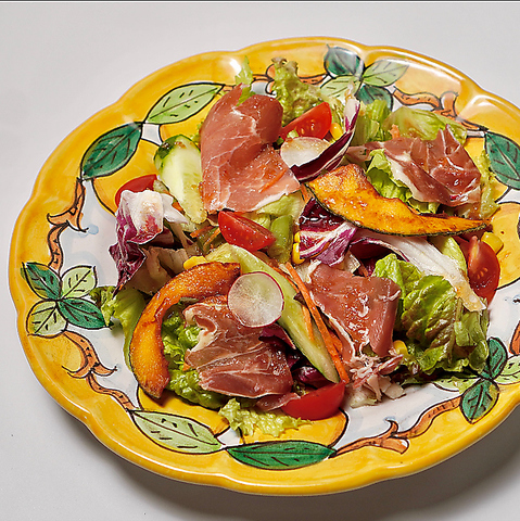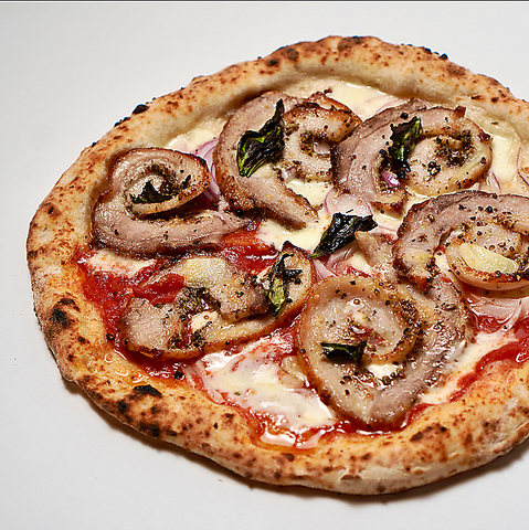 イタリアの伝統的な豚肉料理ポルケッタ。豚バラを開き数種類のハーブをすりこみタコ糸で一本づつ縛り、じっくりロースト後薄切りにして並べました。豚肉のとろける脂とニンニク、タマネギ、黒胡椒の相性は抜群。ボリューム満点のピッツァを是非お楽しみ下さい/サラダ&ドリンクバー付き。