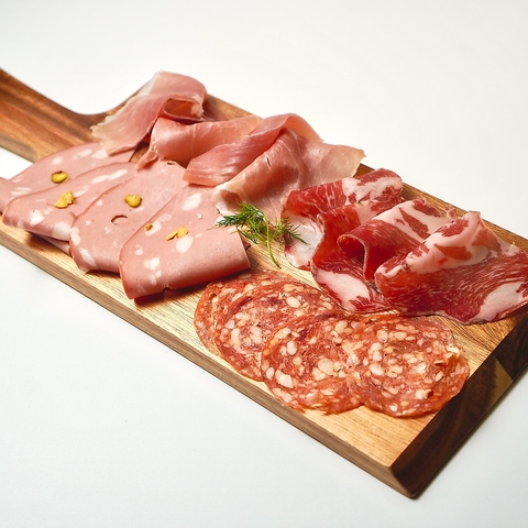 moonイチオシの自家製の前菜盛り合わせ。*写真はブッファラのカプレーゼ、モルタデッラ、生ハム、野菜のカポナータ、パテドカンパーニュ、人参のマリネ、スモークサーモンのカルパッチョ。(※前菜の内容は季節や食材の仕入れによってかわります。)