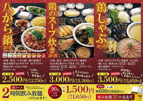 寒い季節にぴったりの鍋コース各種♪お好みの辛さが選べる「八から鍋」やありたどり使用の「鶏しゃぶ」「鶏のスープ炊き」などの新鮮な食材と絶品スープのお鍋を楽しめるコースをご用意!全コース2時間飲み放題を+1650円(税込)で付けられます!あったかお鍋をみんなで囲んで、楽しい時間をお楽しみください!