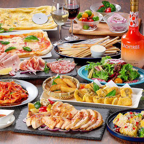 生ハムとサラミの3種盛合せ / 彩り野菜のフリッタータ / レモンクリームチーズ&グリッシーニ / シーザーサラダ / チキンのハーブソテー野菜のロースト / フィッシュ&チップス~自家製タルタル~ / ペンネアラビアータ / 2種のピッツァ(クアトロフォルマッジ&トマトバジル) / 飲み放題50種以上