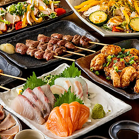 炭火で香ばしく焼き上げた焼き鳥を食べ放題でご用意。ビール付き飲み放題とともに、唐揚げや刺身など和食居酒屋の定番料理も宴会コースで心ゆくまでお楽しみいただけます。