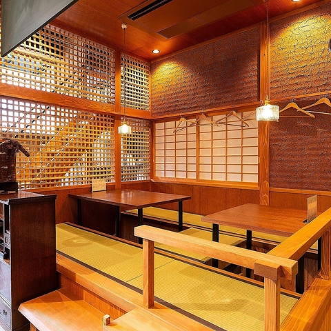 【掘りごたつ席:~4名様×2卓】のんびりとお食事や会話をご満喫いただける人気のお席◎~4名様用の小上がりの掘りごたつ席は2卓ございます。履き物を脱いでゆったりとお過ごしいただける畳の特等席。木の温もりが心地よく落ち着きのある空間は、お食事も会話も両方ともお楽しみいただくのに最適です。