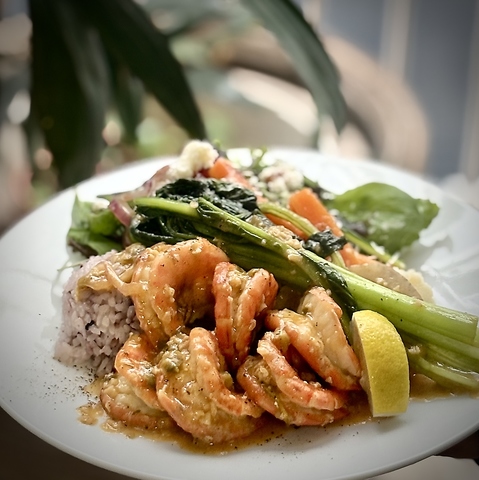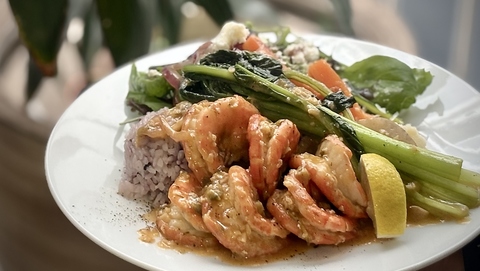 白ワインとガーリックバターのソースで本場ノースショアのガーリックシュリンプをお届けいたします♪