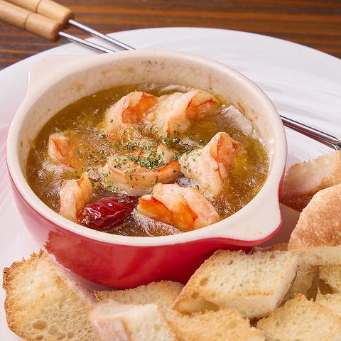 オリーブオイルとニンニクで煮込むスペインの代表的な小皿料理(タパス)。その日の仕入れに応じて最適な素材をご提供いたします。