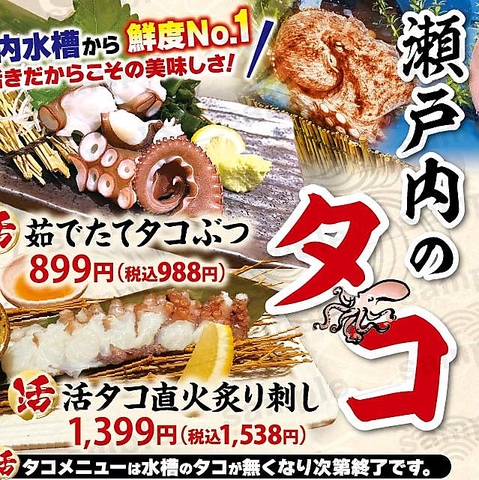 瀬戸内のタコ料理を豊富に取り揃えております!活タコぶつと炙り刺しは水槽から捌きたてをお届け!