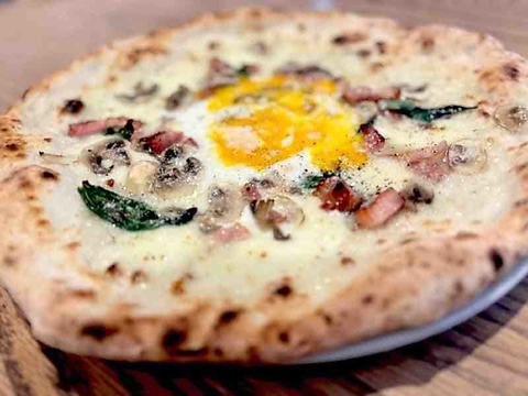 みんな大好き半熟卵とハムがのったトロトロピッツア。モッツァレラチーズをベースにしてお子様も美味しく召し上がっていただけます!