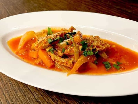 牛の第二胃〈ハチノス〉を丁寧に下処理し、香味野菜とトマトでじっくり煮込んだイタリアの伝統料理。フィレンツェをはじめ中部~南部で広く親しまれており、やわらかくとろける食感と濃厚な旨味が特徴です。