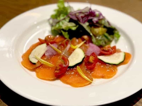 香り豊かなスモークサーモンに、みずみずしいグレープフルーツの酸味とほのかな苦みを重ねた爽やかなカルパッチョ。シンプルながらも洗練された味わいで、前菜として食卓を華やかに彩る一皿です。