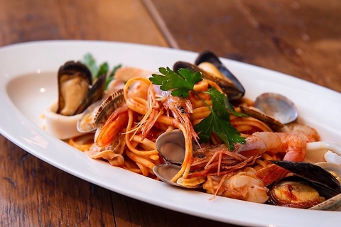 新鮮な魚介と濃厚なトマトソースが絡む極上のペスカトーレ、贅沢な一皿です。パスタにはリングイネ(断面が楕円形のロングパスタ)を使い、より美味しくお召し上がりいたあだけますので是非ご賞味くださいませ。