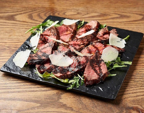 牛サーロインを炭火で豪快に焼き上げたタリアータ(薄切り)に仕上げます。国産牛ならではの美味しさを楽しめるようにシェフがこだわり選んだお肉です。バルサミコソースでお召し上がりください。オープン当初から変わらない人気なメニューの一つです!※火入れでお肉を最高の状態でご提供したく場合によってはご注文いただいて30分程かかる場合がございます。
