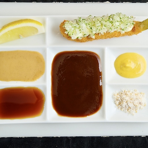 「串の坊」特製ソース・胡麻辛子ソース・胡麻岩塩… 揚げたての人気串カツを、それぞれの楽しみ方で。