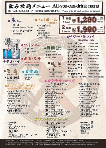 | 料金 | ■2時間飲み放題メニュー 2178円(税込) ■飲み放題VIPコース 3256円(税込) |