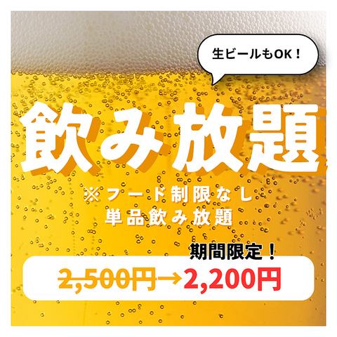 【期間限定】単品飲み放題通常2500円→今だけ2200円!生ビールもOK!1フードの品数制限がないので、2次会にもぴったりです!