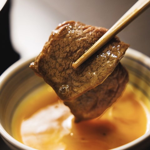 あっさりとした融点が低い上質な脂の肉に合うタレは自家製ポン酢とごまだれで。つけダレの種類は・かつおだし、ゆずこしょう、梅肉、ごまだれとお好みでどうぞ!