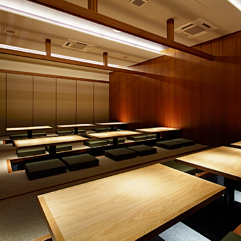 一流デザイナーが手掛けたスタイリッシュな店内★間接照明で落ち着いた雰囲気!!どちらのお席に座ってもゆったりとお寛ぎ頂けます !4名様前後のお席や、最大60名様のエリア貸し切りなど充実♪団体様のご予約はお気軽にお電話ください!
