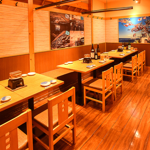 【靴を脱がなくてOK】店内は温かみのある明かりで雰囲気抜群♪気の合うお友達との飲み会や女子会や合コンなどに是非ご利用ください。お席は人数に合わせてご用意できます。ご相談ください!新鮮な海の幸を味わいながら、ゆったりとおくつろぎください。