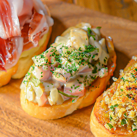 片手でつまめる前菜 "ピンチョス" を種類も豊富にご用意!中でも【生ハムと発酵バターのブリオッシュ】は必食!!