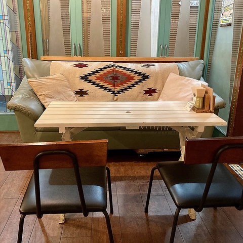 片側ソファベンチのテーブル席となっております。連結すれば最大8名様まで対応可能です。
