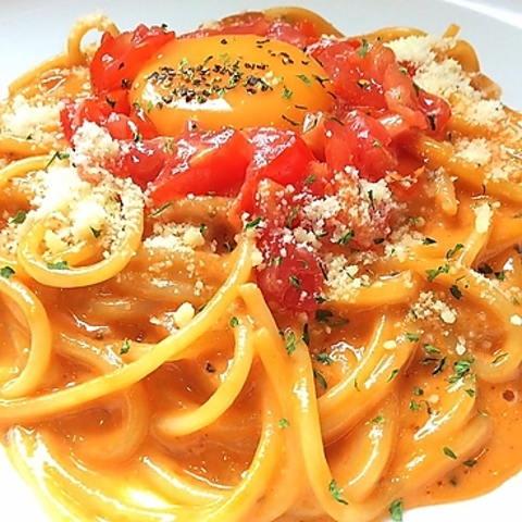 カルボナーラのなめらかさとトマトのさっぱり感との相性は抜群。9割以上のお客様がご注文する超人気メニュー☆