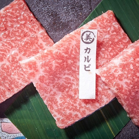 普通のカルビよりさらに霜が入った特上カルビです。(石垣美崎牛 2,728円/ 国産牛 2,068円)Supreme Kalbi (Special Premium Short Rib) Even more marbled than our standard Kalbi, this top-tier cut offers the ultimate melt-in-your-mouth richness.(Ishigaki Misaki Beef \2,728/ Selected Japanese Beef \2,068)