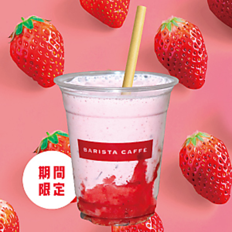いちごの食感を感じる、いつもより贅沢ないちごミルク。旬のいちごで作る真っ赤なバリスタカフェ特製ゴロゴロいちごベース。ベースをたっぷり使って、見た目も楽しい2層のいちごミルクをつくりました。