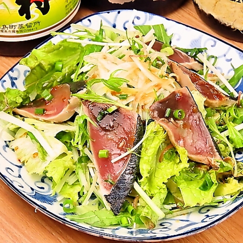 鰹のたたきをのせたサラダに自家製ポン酢ドレッシングで仕上げました。 おすすめ!