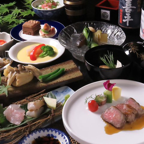 旬の食材をふんだんに使用した料理が並ぶこちらのコースは、毎月異なるメニューを楽しめるのが特長です。季節ごとに変わる一皿一皿は、目にも美しく、味わいも豊かで、訪れる度に新しい発見があります。なお、2時間飲み放題付も別途ございます。